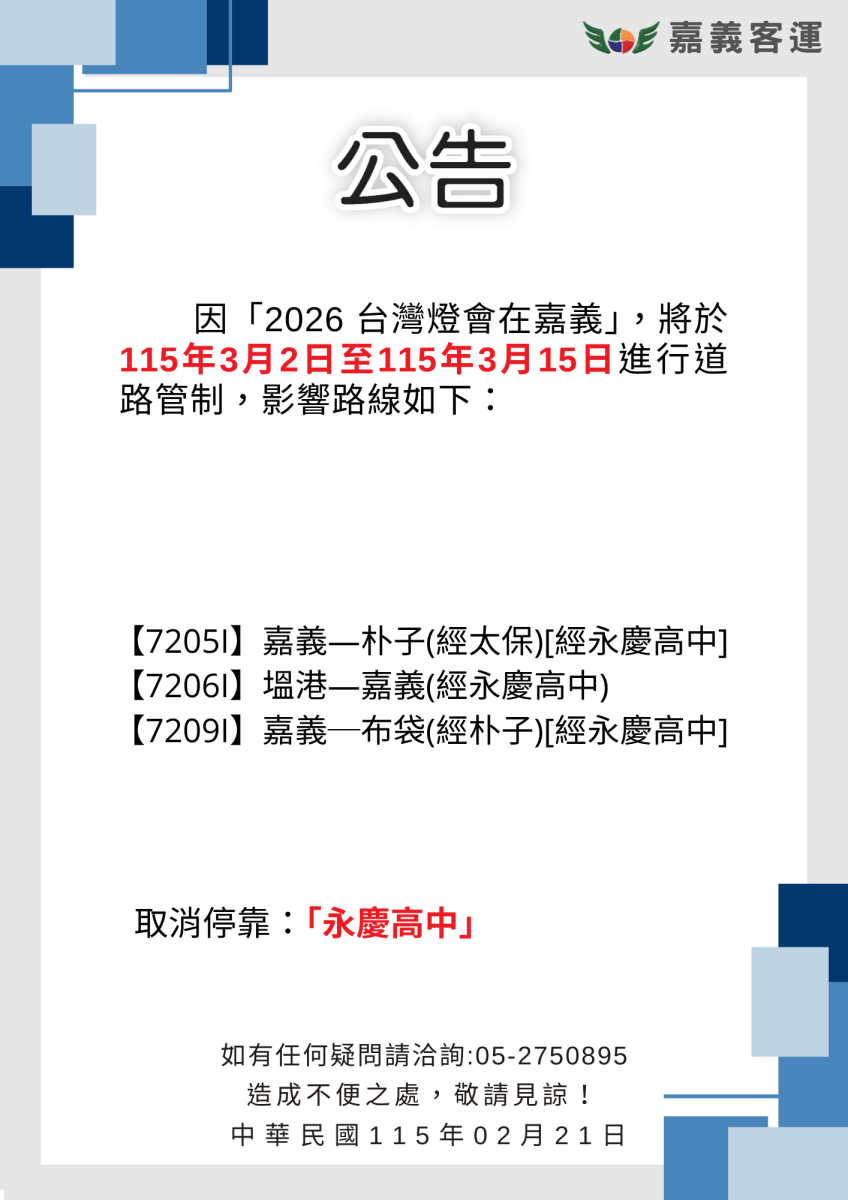 因「2026 台灣燈會在嘉義」,將於115年3月2日至115年3月15日進行道路管制,影響路線如下: