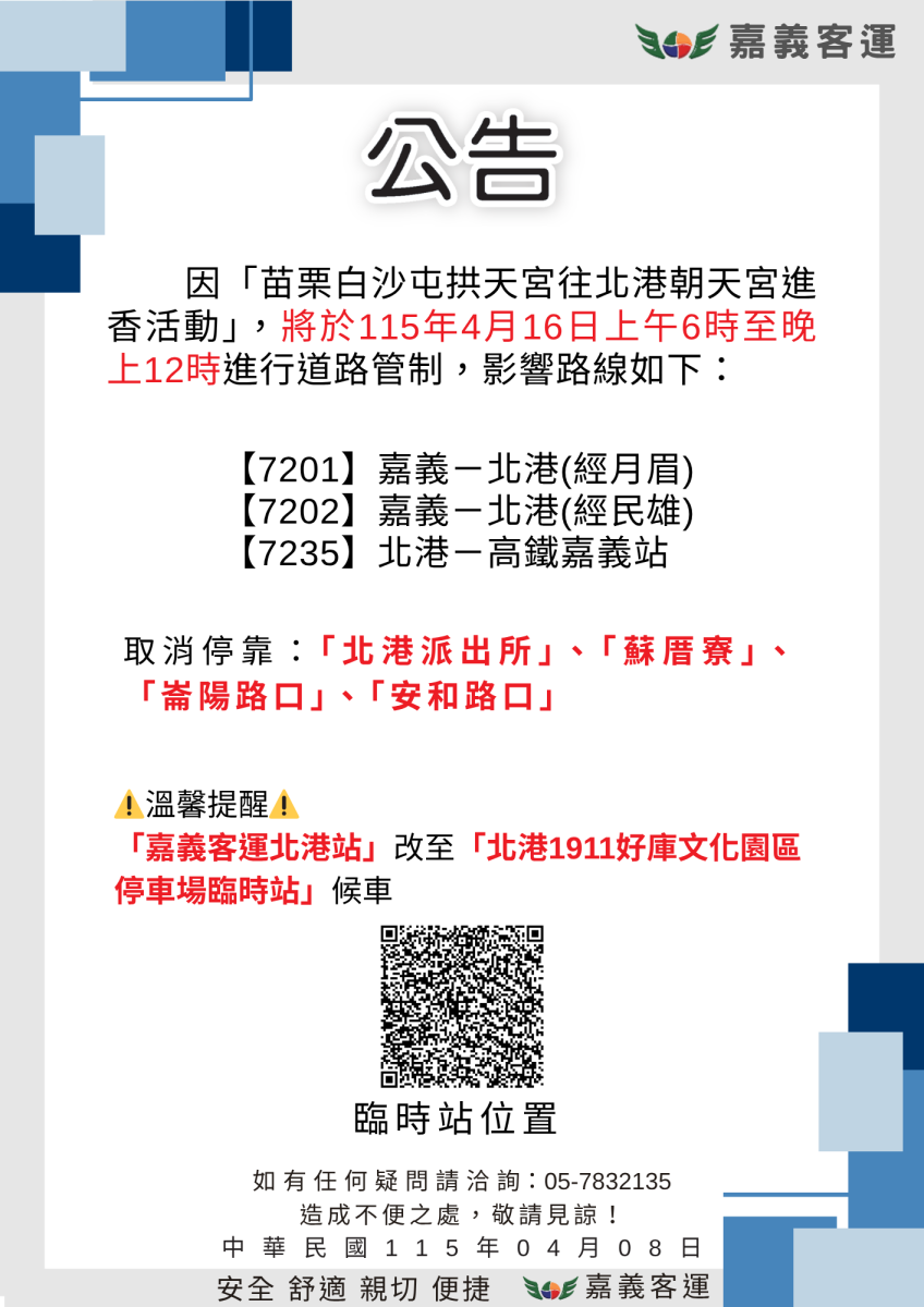 因「苗栗白沙屯拱天宮往北港朝天宮進香活動」,將於115年4月16日上午6時至晚上12時進行道路管制,影響路線如下: