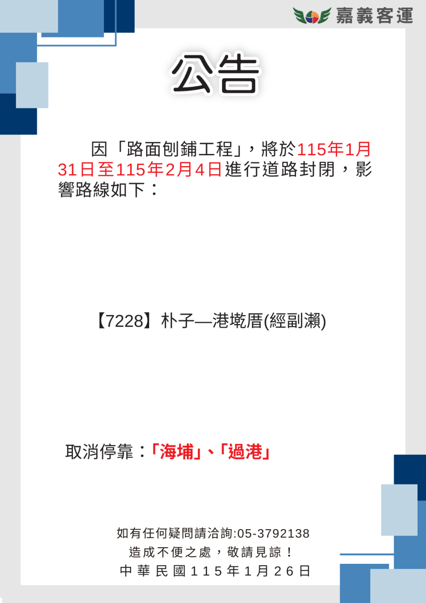 因「路面刨鋪工程」,將於115年1月31日至115年2月4日進行道路封閉,影響路線如下: