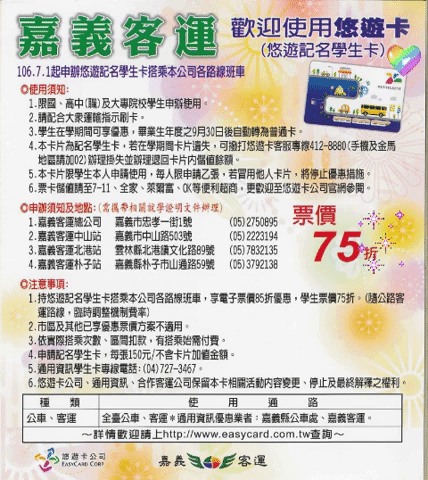 可向嘉義客運總公司購買(學生IC卡是記名卡,不可轉讓使用 遺失請洽悠遊卡公司412-8880(手機請加02)